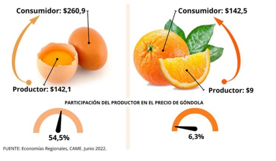 En promedio, la participación del productor en el precio final de venta fue del 25%, explicando tan solo una cuarta parte del precio de góndola. Los productores de huevos obtuvieron la mayor participación, mientras que la más baja ocurrió en la naranja.