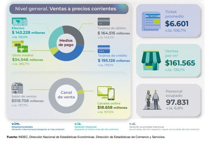 En centros de compra, las ventas totales a precios corrientes en agosto alcanzaron un total de $147.490,2 millones, lo que representa un incremento de 158,9% respecto al mismo mes del año anterior.